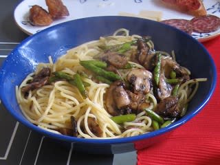 そしてこれはおいらが作ったパスタ1品目。ブラウンマッシュルームを3-4mmの厚さでスライスし、そしてミニアスパラガスを笹がきのように切って少しガーリックペーストを加えて、塩と胡椒とオリーブオイルで炒めたものをパスタに乗せています。パスタには下味として湯掻いた後に少しだけ秘密の味付けしています。これは内緒です。。w