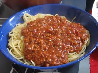こちらは、パスタは同じなのですが、ボロネーゼ。ホールトマトを潰してオリーブオイルと塩と胡椒と少量の水を入れて煮込み、その後、これまた秘伝の調味料を加えて水気を飛ばす。別のフライパンで合い挽きのひき肉をこれまた秘伝のレシピで炒めた上に(この炒めたひき肉だけでも充分美味しいのだ!)先ほどのトマトを絡ませる。これまた絶品!(自分で言うな!)
