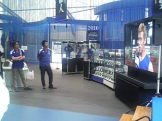 JFAのNくんのご厚意により代々木第一体育館横のサムライブルーパークでサッカー関係者と日本対デンマーク戦を観戦。
