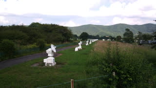 45mの大きな電波望遠鏡と連動して、隣の広大な庭には小さな墓標のごとく小さな電波望遠鏡が並んでいました。墓標は言い過ぎとして、フォルム的にはチェスのナイトみたいな感じで、それがいっぱい並んでいましたな。