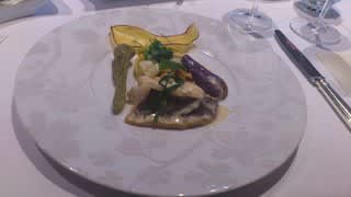 五島のタチウオと秦野の秋野菜のミルフィユ仕立て、丹沢の幸水梨添え