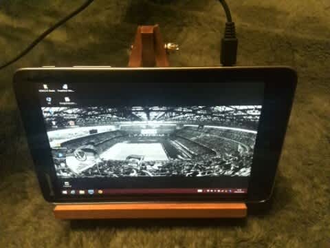 で、購入したイーゼル、とても100円とは思えない程しっかりしたもので。こんな感じでタブレットを乗せています。