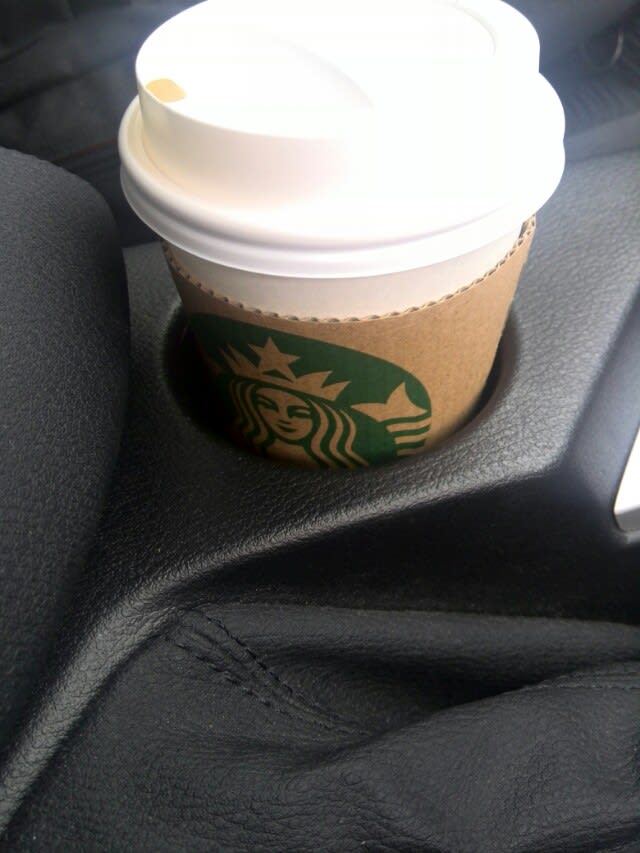 仕方ないので車移動。そして朝ご飯を食べる暇なく出掛けたので途中環八のスタバのドライブスルーを利用。まるでアメリカ人のような?朝ご飯。コーヒー飲んでシャキッとね。