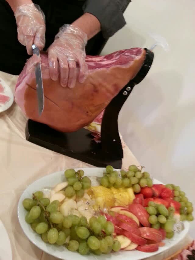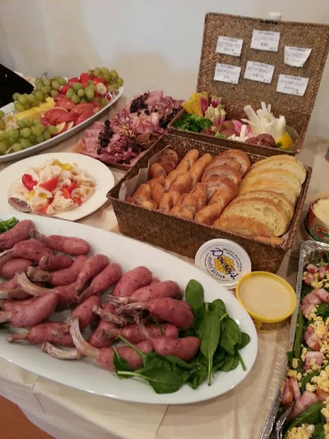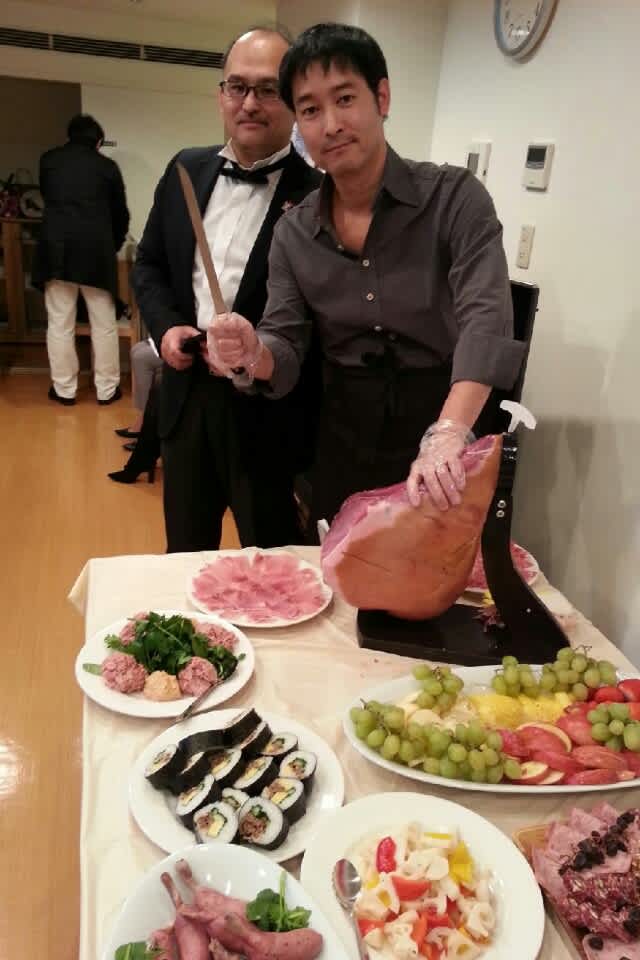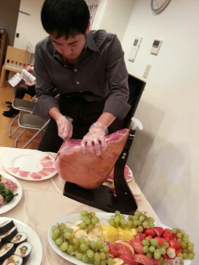 彼、あまりワインが飲めないのにワイン会に来てくれてホント皆のために生ハムを切り分けしてくれた。実は彼、以前独身時代に自分の家に生ハムを買って置いていて、切り分けるのがとても上手。生ハムって意外と切るのが難しく、ナイフが透けるくらいの薄さでどんどん切ってもらいました。なにせ参加者は30人を超えており、一人一枚しか食べないなんてことはなく、ひたすら切って行かないと全然追いつかない…w。