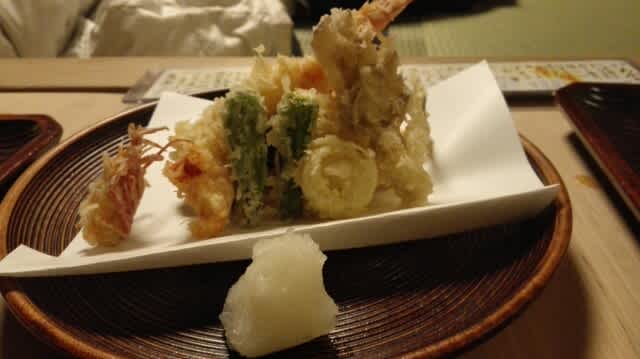 そして天ぷらの盛合せ。2人で半分子なので全部は食べてませんけど、穴子の天ぷらは絶品でございました。