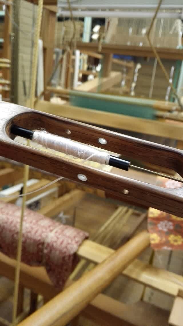 杼(ひ:英語ではshuttleと言う糸通し)は大分の赤松を20年乾燥させてからだったり、糸通しの穴は清水焼を使用したり、杼の先は真鍮を使用したり、と、それぞれに伝統技能が伝承されてこそ成り立つ。使われていくうちに徐々に手垢が付き、それがまた良い色合いとなるだけではなく、自然と物として良くなるようである。