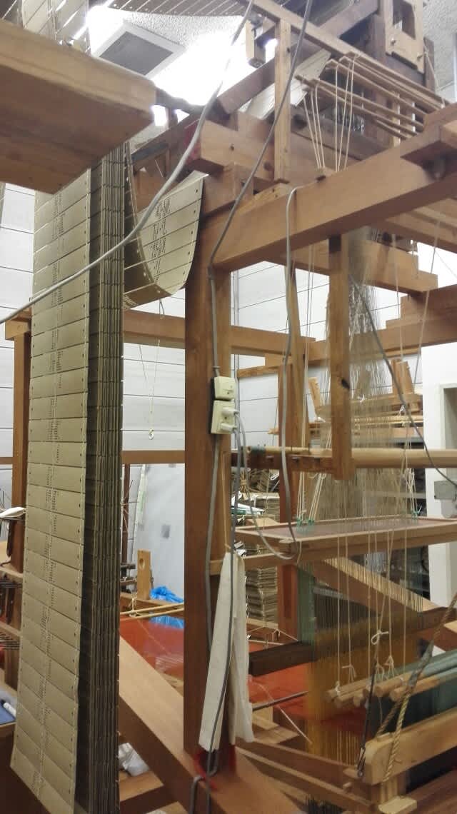 機織りを見学させて頂いたが、兎に角この技術はずっと継承されてきた日本文化の集大成である。この穴の空いた紙は折模様のデザインの再現性を来して作られたジャガードであるが、こう言った紙も最早作り手が沢山いる訳ではないらしい。作りとしてはかなり頑丈にできているようだが、昔ながらの知恵の集約がある。現代の科学では勿論こう言った機械は自動化されており、以前は豊田自動織機や村田製作所がこのような機械を更に精緻化していったようである。