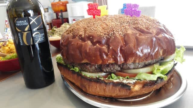 お誕生日の本人にはケーキよろしくバーガーのファーストバイトw。