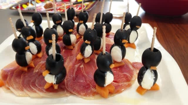 オリーブを2つ重ねにしていますが、下の方は切ってクリームチーズを入れて、足はニンジン。