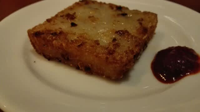 そして、大根餅。おうちで作ってもここまでにはならないね、と奥さん。美味しいんだよねぇ、外で食べると。ここのは乾燥した海老が入ってましたな。この赤いペースト状のモノは正直言えば正しい名前は知りませんが、辛い醤でした。付けると更に美味しい。