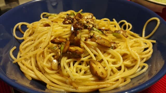 アスパラガスとマッシュルームをオリーブオイルとトリュフオイルで炒めてディチェコのNo.11と共に。
