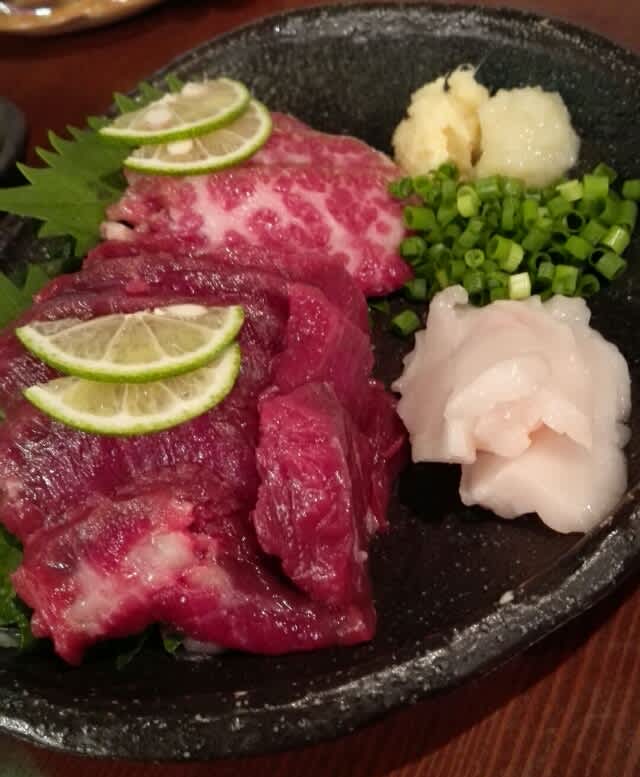 そして馬刺し。Instagramに挙げると多分外国人から非難されるんだろうなぁ、なんて話していた。牛は良くても馬がダメな理由はおいらには分からん。って言うか、馬刺し大好きなんで、止められても食べるしね。九州独特の溜醤油がまたよろし。おいらは二菱って言う溜醤油が好きだけどここのは違った。また違う溜醤油を発見ね。