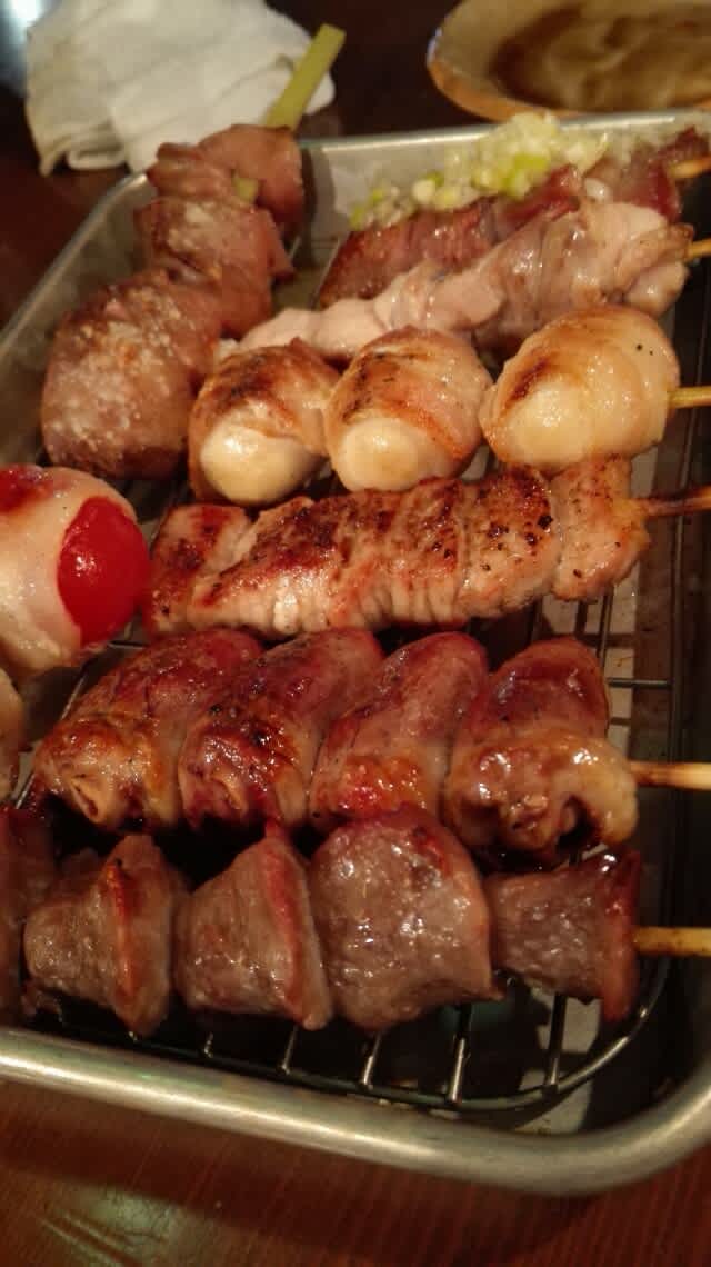 基本的に九州の食べ物を扱っているお店のようで。最初は串もの。美味しかったね。ベーコンでトマトを巻いた串とか美味しかったな。