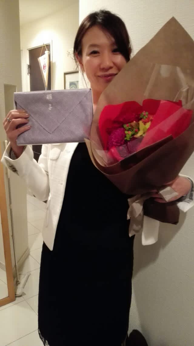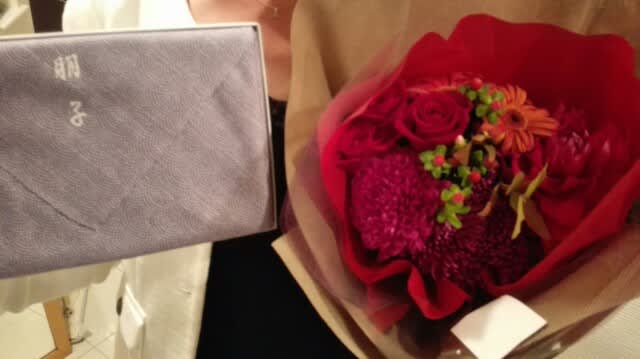 そして、食事の終わりかけにorderしていた花束を。更に、武人と晴ちゃんから『朋子』と名前の入った着物の時に使う風呂敷をいただきました。