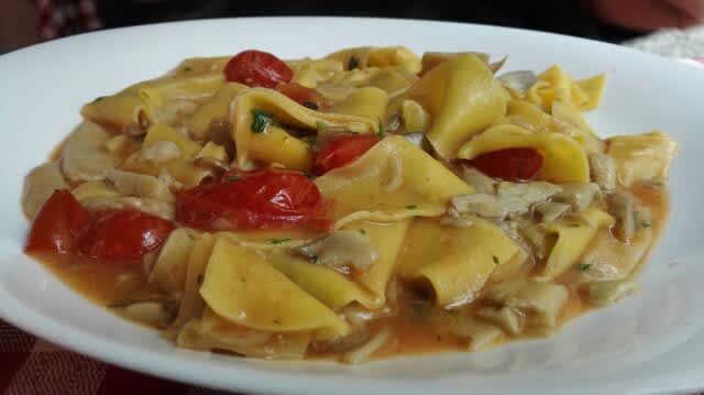 奥さんはPappardelleのトマトソース。トスカーナとかでよく出てくるみたいね。この平打ちの大ぶりの麺は中々味と絡まなかったりするんだけど、美味しかったです。