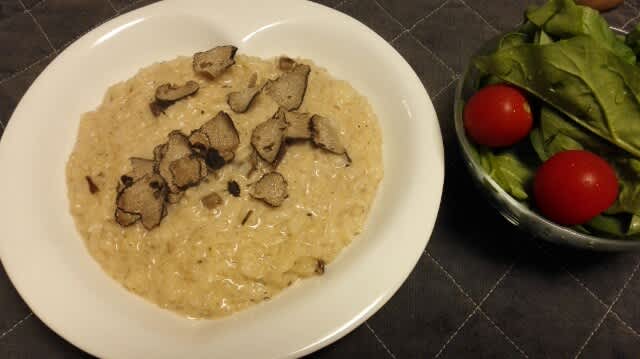 生米からRisottoを作りましたので、最初は水をお鍋に張った状態から生米を炊きましたがその際トリュフ塩とコンソメをポルチーニと一緒に煮込む。その上で牛乳を入れて更に煮込む。このタイミングくらいで黒胡椒とガーリック粉を少しだけパラパラと。そしてまたグツグツと煮込む。かなり弱火で30分程煮込んで出来上がり。サラダと共に奥さんと食しました。