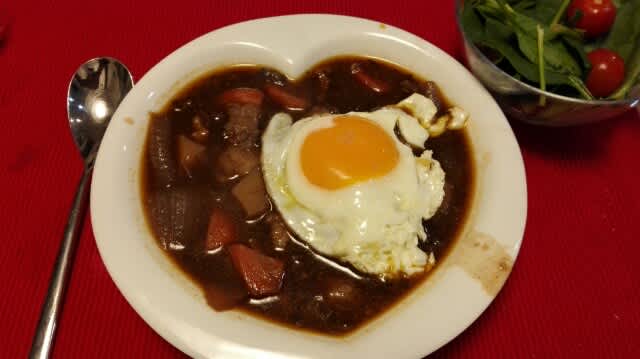 と言う訳でグツグツとジャガイモ、ニンジン、タマネギを入れて、更にイチゴジャム、胡椒、ウスターソース、コンソメとかを入れて、最後にバターとかを入れて完成。隠し味はトリュフオイル。目玉焼きを食べたい?って聞いたら、ニコニコな顔をするのでw、この前買ったばっかりのフライパンで焼いて乗せてみた。