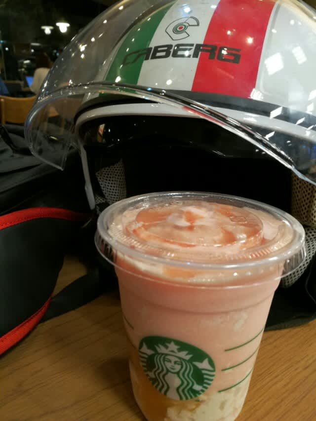 少々どころではなく、完全に寒い状態。決して肌寒いと言う感じではなく、寒い、が正しい表現です。バイク乗りは季節が1ヶ月以上早く来るんですよねぇ。この時期、夜9時過ぎともなると、246を60kmくらいで走ると寒くてね。なのに、到着してオーダーしたのは新着のフラペチーノ。どうもこのフラペチーノと言うのは値段がムダに高いので、2人で仲良く半分個にしました。ネクタリン ピーチ クリーム フラペチーノ® with ティー ババロア、と言うらしい。はっきり言って、メチャクチャ甘い。。。甘すぎるくらい甘いっす。二度と食べないとかはないですが、兎に角甘い。甘すぎて喉が乾いちゃいましたね、、、