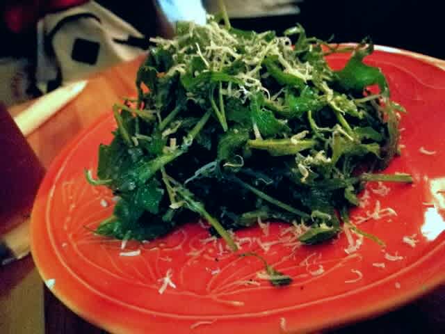 ルッコラのみのサラダにしてもらって、塩、レモン、そしてパルミジャーノ・レッジャーノと黒胡椒を掛けて食す。