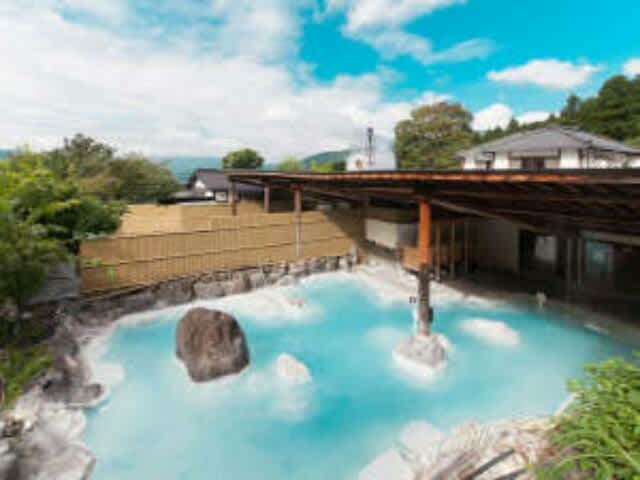 何故か、湯の色が青白い。そこまで深くない露天風呂は外から見ると青白い。部分的に熱い部分があったりしましたが、全体的には温めかな。下記はじゃらんのサイトからDLしてきました。実際の色目、こんな感じでした。