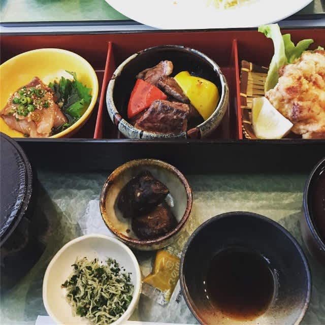 3階の4つある飲食店のうち、滑走路側によく行くね。今日はブルースカイの方に。奥さんのご所望で。で、奥さんが食べたのはえらく豪華なセット。りゅうきゅう、豊後牛、とり天のセット。