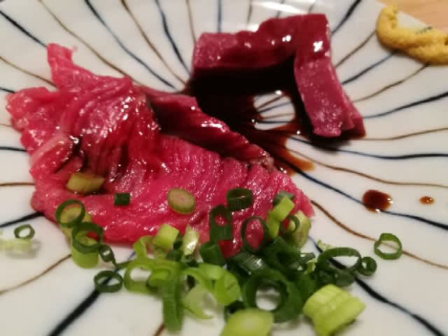 最初に来たのは、ハツとハラミのお刺身。この2つの部位の食感はまるで違うので比較は出来ないけど、ハツのしゃっきり感はとても良い。歯応えがある程ではないけど、この微妙な柔らかさと硬さはとても美味しかった。一方で、ハラミのこの薄造りはあとから運ばれるハラミの塊の布石であることは、後から知るのだが、このハラミは間違いなく絶品であった。