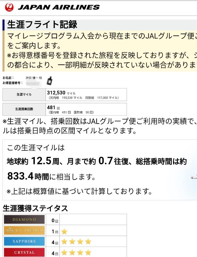 ふと、生涯フライトマイルを見てみると450回を超えていました。