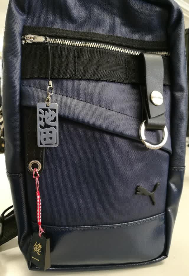 そして、このポーチのファスナーに、以前大分の量販店で買った自分の名前のストラップを。クライアントと夜中に試合準備のために行った九州にしかない地場の量販店の店先で、なんか良い感じと思って買ったものをこれに付けてみました。あと、奥さんがふるさと納税の返礼品でもらってくれたおいらの名前が入った根付も。これは、裏側が「左馬」になっている。