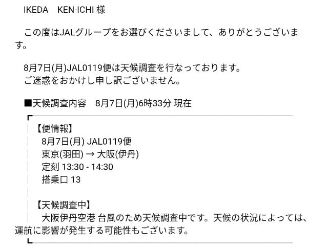 おいらの場合には、初めて『天候調査』と言うタイトルでのメールが来た。まだ調べ途中らしいが、九州、四国行きのFlightはバンバン欠航になっている。