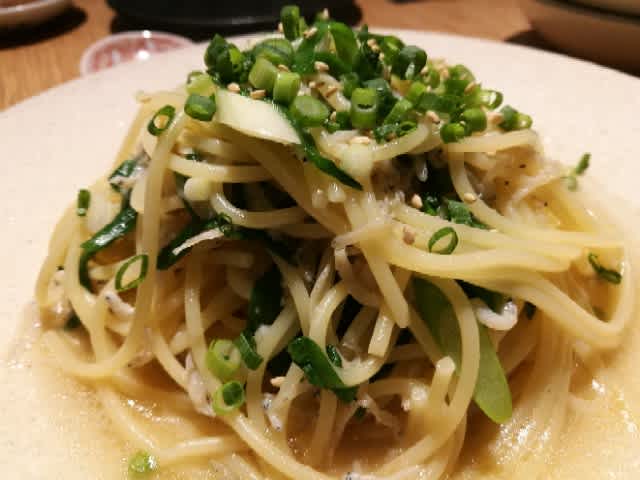 しらすと青唐辛子のペペロンチーノ。優しい塩味で、とても良い味付け。コピーしたい。