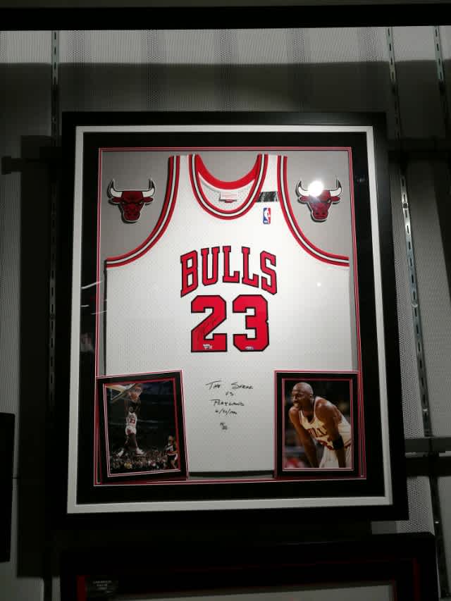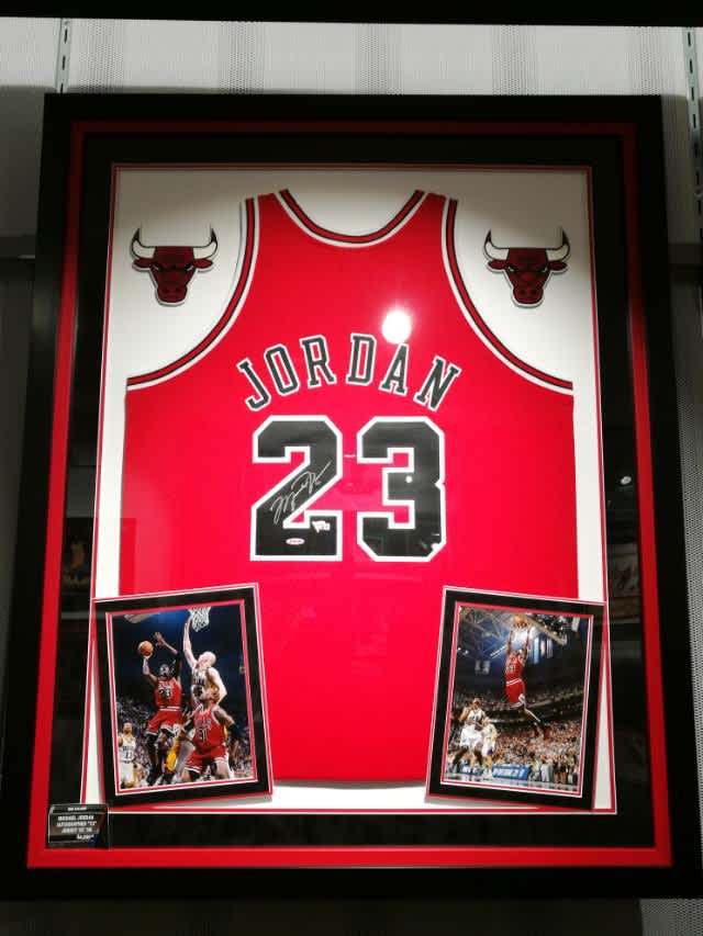 地下だったと思うが、MJの直筆サイン入りユニが額装されていた。復帰後の45番のものや、コートを切り刻んでブロックにサインがされて売られていたり。