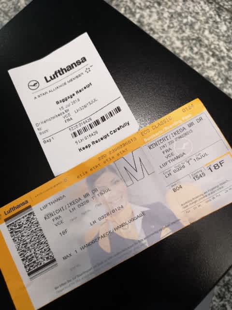 これも指定された場所に自分で貼り付ける。そしてそのtagにあるバーコードを一度読むのだが、これが読み取り不能でやり直した…(苦笑)。2回目は問題なく進み、晴れてVeneziaでの再開を祈るのみ。もし、無くなったら写真の白い方の紙で探して貰うしかない。大概見つからない?みたいだけど。マジ、祈るのみ。フランクフルト空港のバッゲージハンドリングなんて信用出来んけど祈るのみ。。。