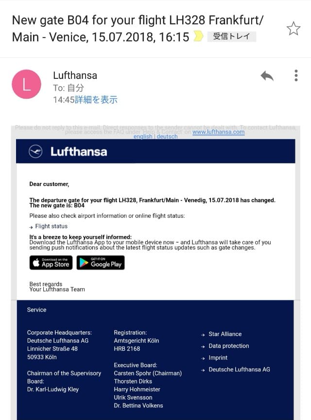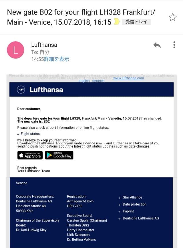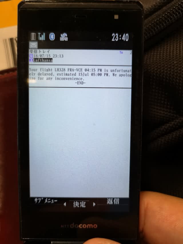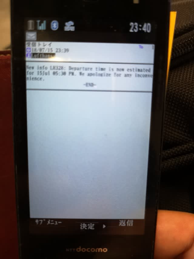 そしたら今度はなんとガラケーのSMSに遅延のお知らせが。ただ、これもね、最初は15時45分にボーディングと言っていたのが、アナウンスで10分遅れから15分遅れ、と言っていたところからの始まりで…。並び始めたら、16時10分になってから、更に10分から15分遅れる、と。