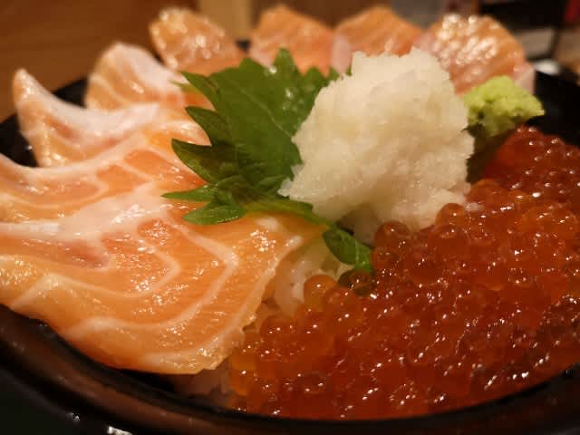成田空港ではラウンジで少し食べてから機内で寝るので、出国前の最後のまともなご飯かも。それで鮭いくら丼と言うねw。