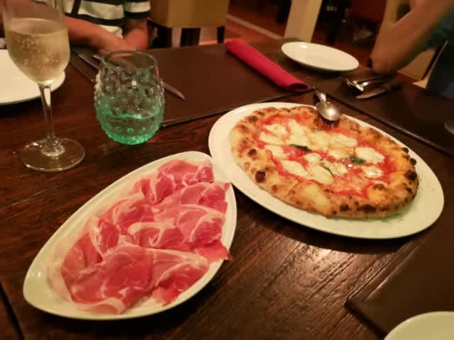 で、色々と食事をオーダー。運ばれてきた順で言うと、まず、Parma & Pannaと言うPizza。これは生ハムを後乗せで食べる形式。生ハムもpizzaも美味しい!