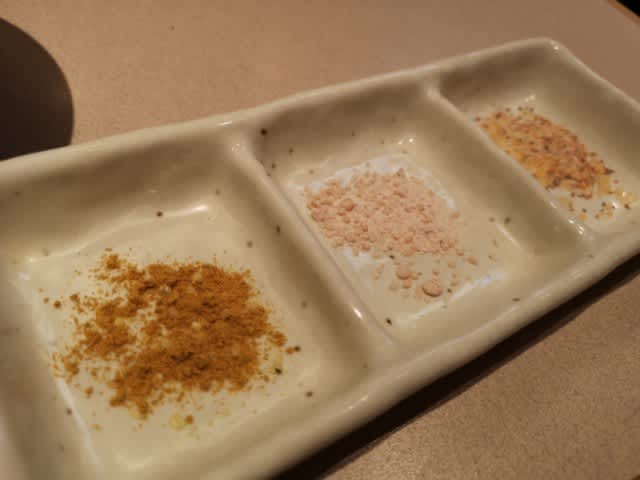 これを、変わり種の塩に付けて。左からカレー塩、梅塩、七味塩の順番。中々ガツンと来ましたね。