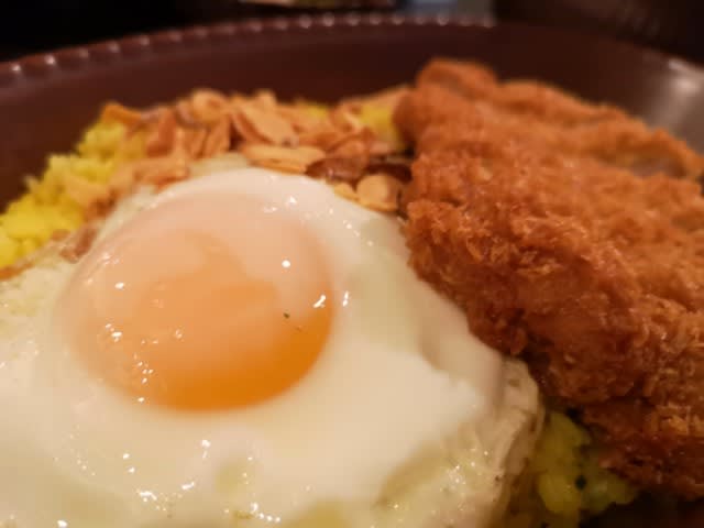 カツカレー、ガーリックチップと目玉焼きと言うこの変わらないオーダー。前は大盛りをご飯もカレーもしていたけど、両方とも普通で。