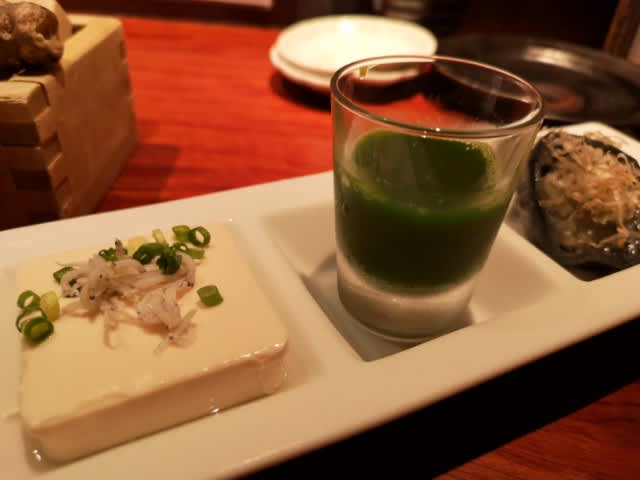 この付き出し、真ん中の青汁は、臭いの時点でoutで…苦笑。これ以外の冷奴、ナスの煮浸しは美味しかったっすなぁ。