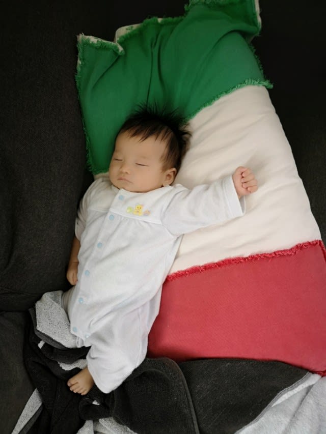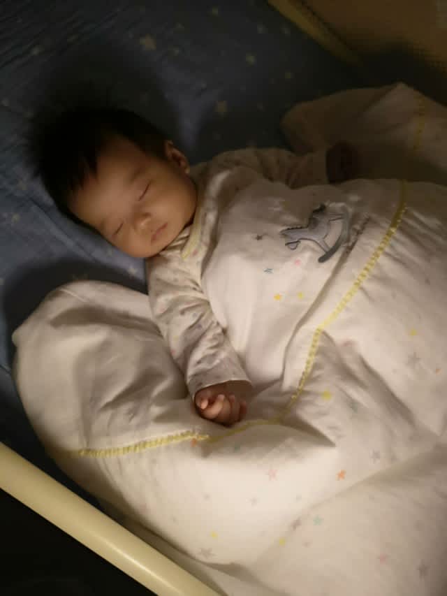 そして、脚力だけで2ヶ月半の月齢で寝返りする程足の力が強い為、お包みで寝かせても蹴飛ばして終了と言うね。まさか自分でもう一度掛けたりしないから、次の授乳まで最大3時間とか4時間、何も掛けないで寝ていることもきっとあったろうに。なので、蹴り飛ばせない程のふわふわ感だし、重量感なのできっと温かく寝ていることでしょう。