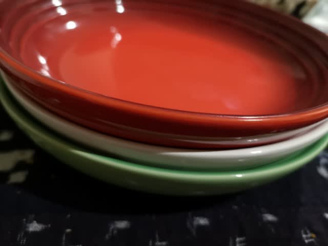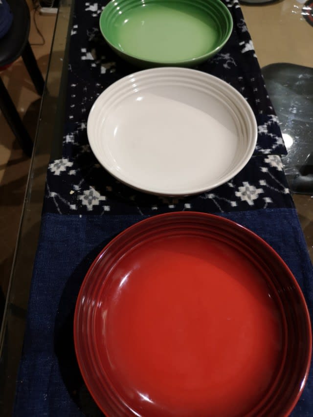 みらんちゃんの授乳中に1人でぷらぷらしていたら目の前にLe Creusetがあって。フラっと入ったら、処分セール的に安くなっていて。ほんの少し色ムラがあると言うが、赤も緑も分かりませんでした。白はね、やや。それで、定価の半額と言うのだから、Le Creusetのお皿じゃなくても普通にそれくらいはする値段に。いや、買いでしょう。