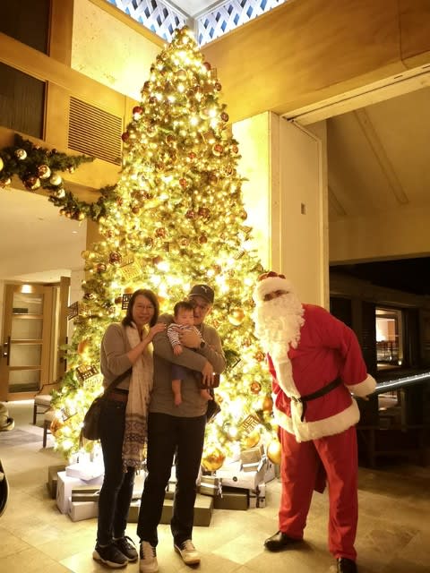 ロビーに大きなXmas treeがあるなぁと思ったら、サンタクロースが休憩していて…w。