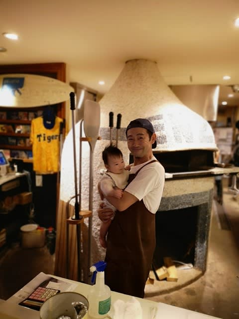 うちの子を抱いてくれましたんで、石窯の前でパチリ。