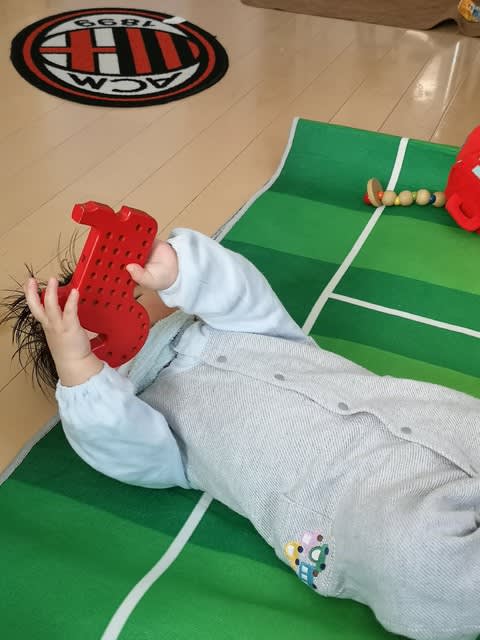 で、それを敷き詰め直して、Milanのロゴ入りピッチマットをもう一回敷いた。なので、物凄くクッション性が向上。なので、もしお座りの状態から、ごろんってなっても、仮に頭ぶつけてもまぁ、大丈夫。