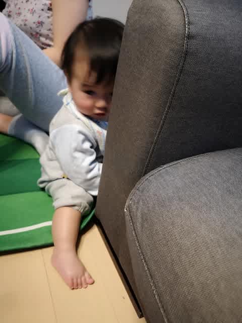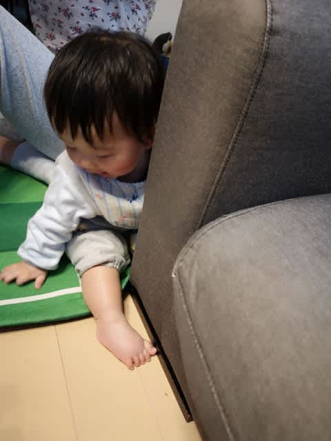 ただ、我が家、中々彼にとってつかまり立ちをするポイントがないみたいで。コルビュジエのガラステーブルの周りはゴムで覆ったのだが、どうもこのガラステーブルが丁度良い高さらしく…。ただ、そのゴムをメッチャ舐めるので、出来れば触らせたくないな、と。とは言え、他に掴まれるところもなく、、、と思っていたら、Living Roomのソファーに掴まろうとしているみたいで。