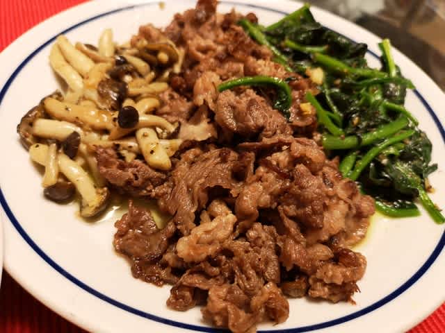 今日は、仕事の後に松陰神社商店街のお肉屋さんで良いお肉を安く手に入れ、それをItalian風に味付け。それと、鉄分の足りない奥さんに良かったのだが、ほうれん草をガーリックを刻んで入れたオリーブオイルで炒めたり、しめじを同じくアヒージョ状態にしたオリーブオイルで煮込んだりしてね。