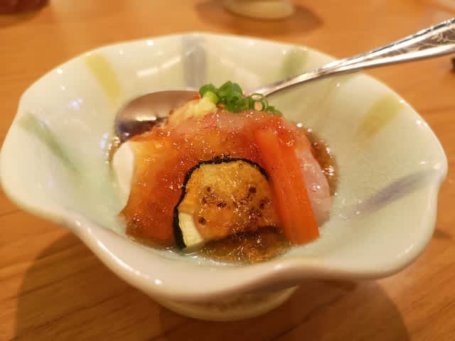 お刺身の中で、ハタ、美味し。あとはその左の枝豆の豆腐も。これはみらんちゃんバクバク食べてました。手前のトマトの揚げ物も絶品。