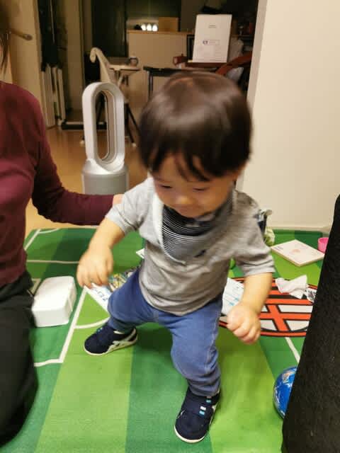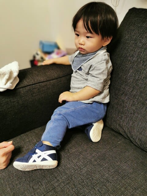 先日は公園デビューをしたものの、まだまだ歩いていないので、靴を1足のみ降ろした。それ以外は自宅内に置いたまま。リビングには慣れさせる為に1足置いてあるが、これがいつぞやおばあちゃんに買ってもらった靴。夕飯後、自分で持ってきて履かせてもらった。