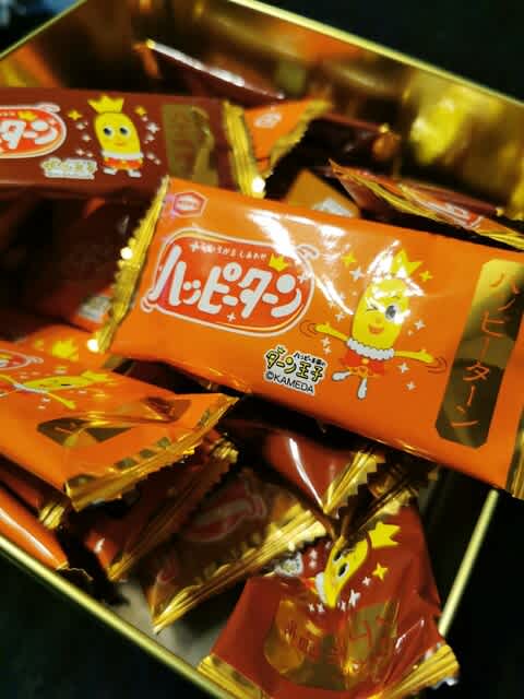 この箱、紙ではなく、缶。金色の缶にハッピーターンが入っていた…。しかし、缶とは。。。