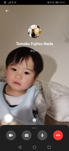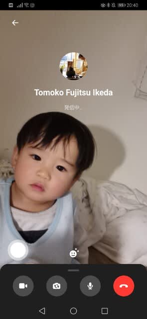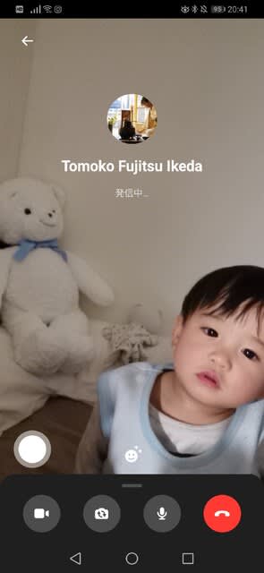ベッドでアンパンマンのお気に入りのスリーパー着せて、仮初に奥さんにビデオチャットを試みたのだが、出ず。。