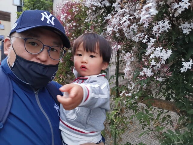 そして、お隣とか、舗道とか、咲いている花をまだまだ見たかったみたいだけど、また雨が降ってきて。あ、奥さんが保育園に着いた瞬間に雨が止んで…(苦笑)。私、何しに?って言っていたけど、まぁ、良いじゃない。